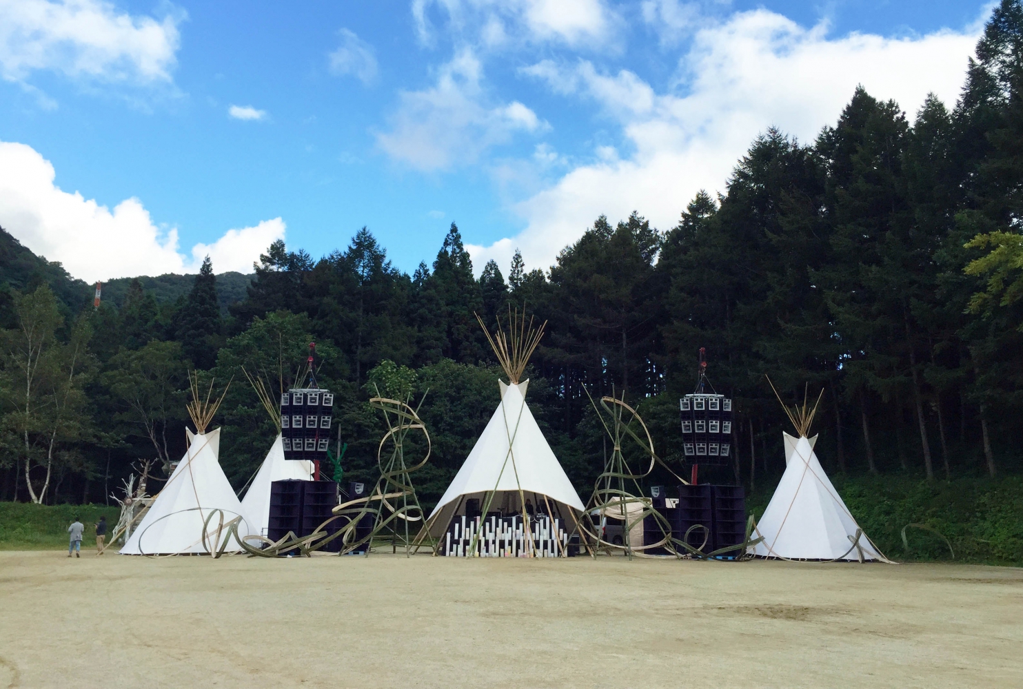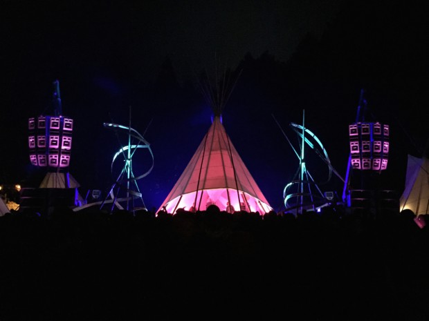 Une fois déposé sur le dernier parking, l’excitation monte. Il est 16h, et l’on entend les basses du soundcheck qui résonnent. Après un rapide passage à l’entrée où l’on vous demande si vous n’avez pas de bouteilles en verre (vous pouvez apporter tout ce que vous voulez en boisson et nourriture), j’arrive sur le dancefloor. Les organisateurs apportent un soin particulier à la scénographie. Le dj booth est surplombé d’un grand tipi, lui même entouré de deux sculptures en bambou, de deux grappes d’enceintes Funktion One et de deux autres tipi. Autour du dancefloor on trouve un bar, et diverses boutiques de bijoux et vêtements dans un style plutôt hippie. Un côté est à flanc de montagne, bordé d’arbres, l’autre côté est ouvert et bardé de drapeaux étendards tout le long.